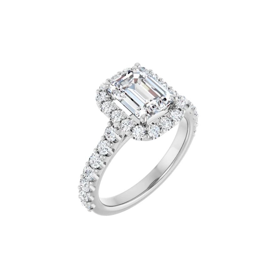 ( Voorbeeld Emerald 8×6 mm ) Deze ring maakt deel uit van de dummycollectie AU/Halo.Ess002
